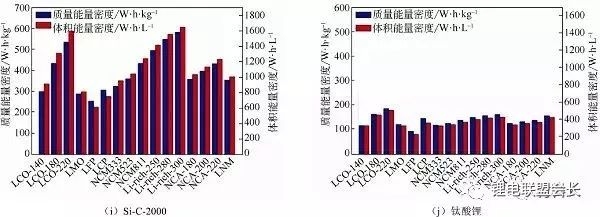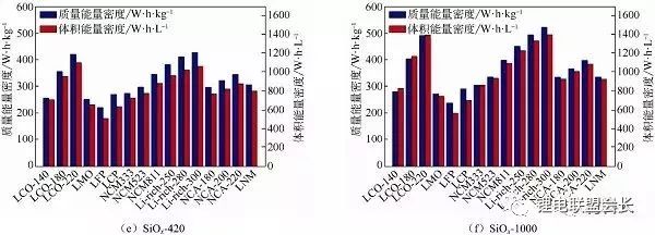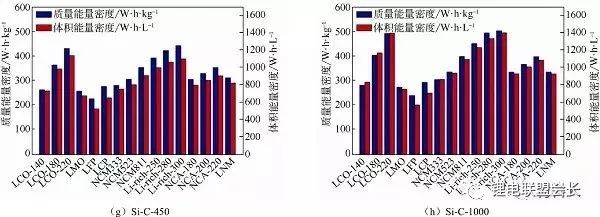 圖2不同負極材料與不同正極材料匹配的電芯能量密度計算(a)石墨;(b)軟碳SC-400;(d)硬碳-250;(e)SiOx-420;(f)SiOx-1000;(g)Si-C-450;(h)Si-C-1000;(j)鈦酸鋰
